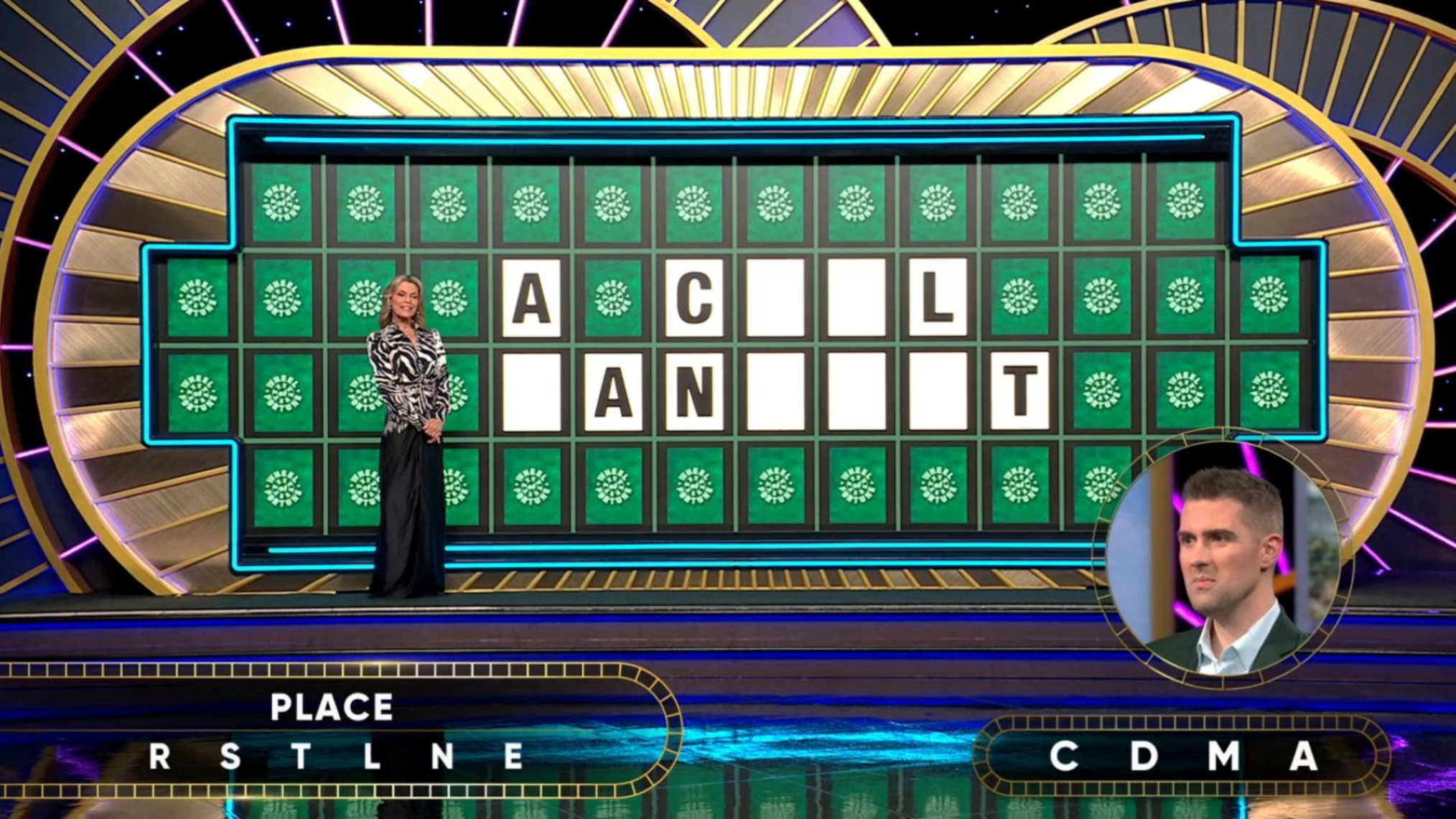 Thompson was given “R,S,T,L,N, and E” by Wheel of Fortune. He picked “C,D,M, and A” to round out his puzzle. It then looked like “A C_ _L _AN_ _ _T.”